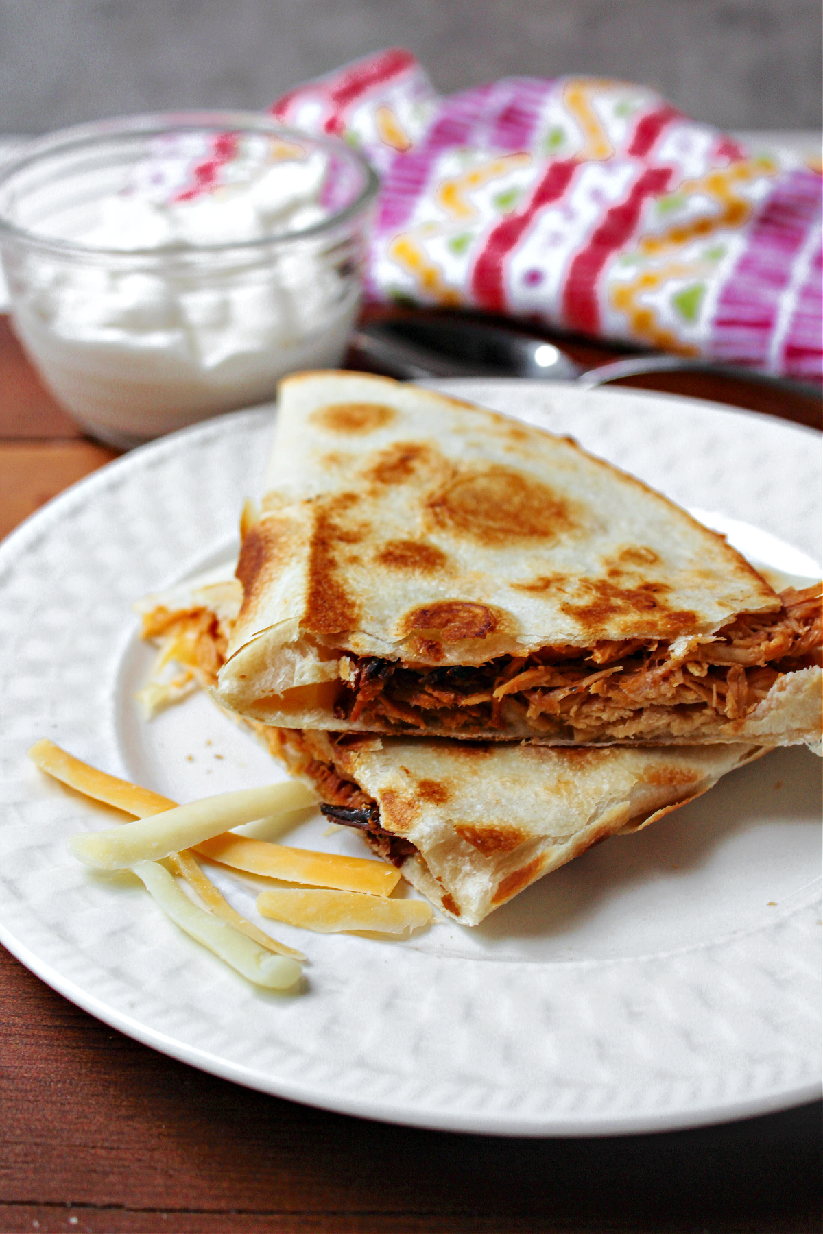 The quesadilla is crunchy with the melted cheese and smokiness of the BBQ flavor. This supper recipe is great for those busy nights and is a great on the go recipe. It also uses up leftovers. It's a win/win!