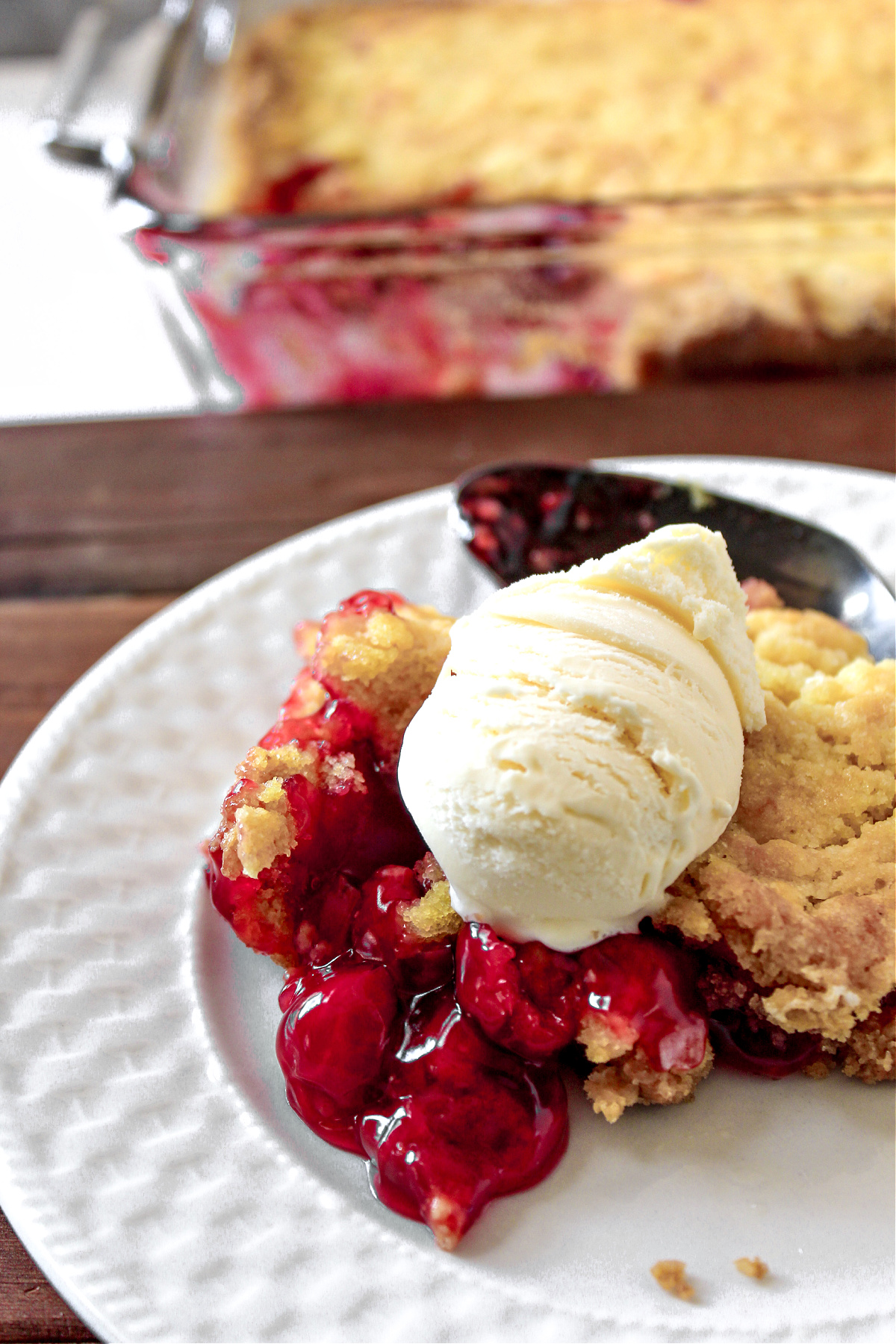 The simplicity of this Cherry Dump Cake is one of its finest qualities. Of course, it tastes fabulous too! It all starts with a yellow cake mix and a can of cherries. The end is the whipped cream or ice cream you can put on top. It is a simply amazing dessert recipe!