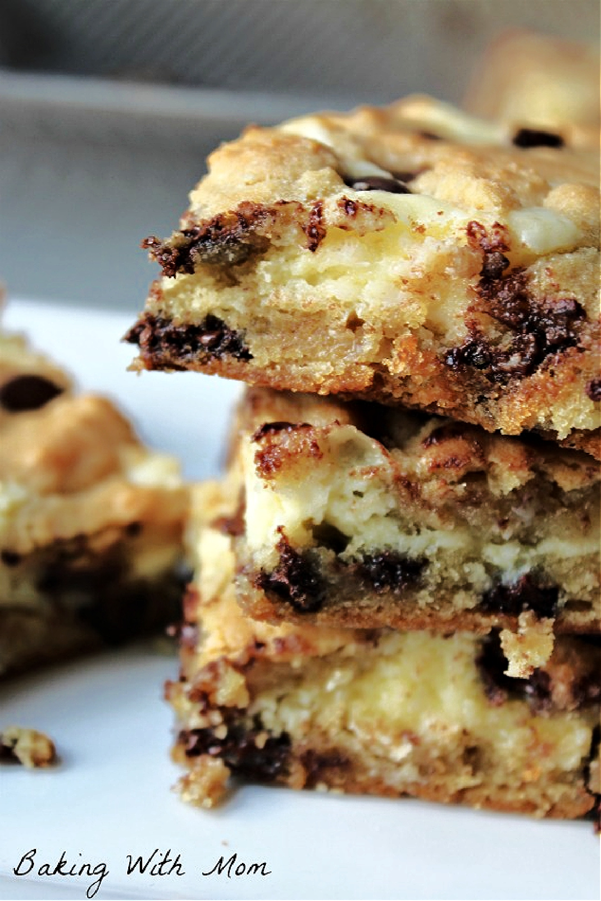 It is important to note that the batter will not cover the entire top of the cookie bars. The cream cheese mixture will pop through and that is okay. It is not only tasty but makes the bars look amazing too!