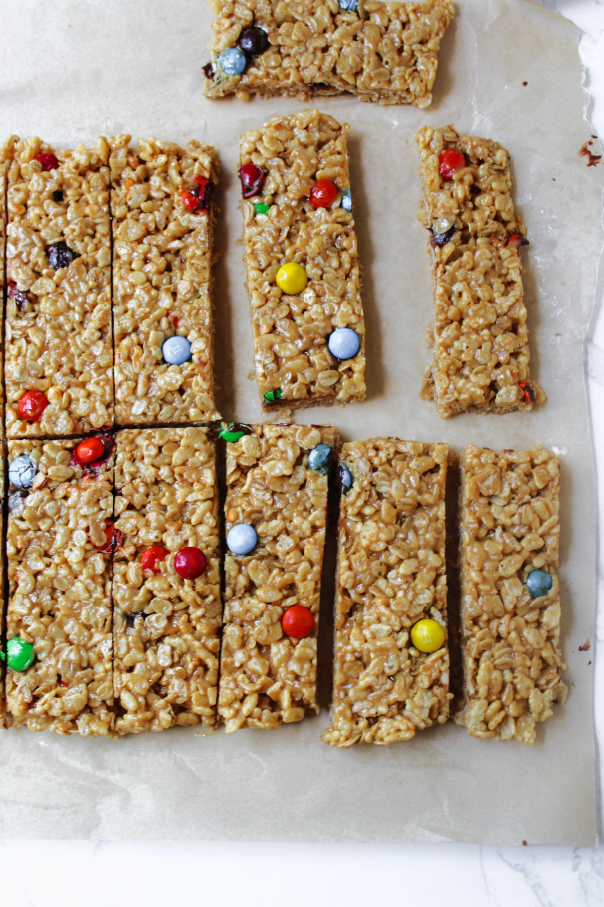 - Mix in oats and crispy rice cereal into the marshmallow and peanut butter mixture. Add in M&M's.